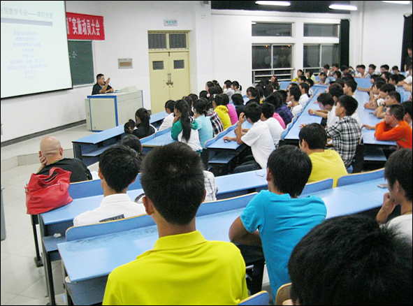 2011年9月10日晚7点,数学科学学院举行2011级新生入学教育首场报告会。数学科学学院党总支书记余志朝、院长李庆宏教授以及各专业辅导员、2011级全体新生参加了此次报告会。报告会由余书记主持。余书记首先对来到数学科学学院的2011级学子表示热烈的欢迎并预祝他们能在数学学院收获丰收的果实。随后,李庆宏院长做了题为《新起点,新征程,新跨越》的入学教育报告。李院长先首先介绍了数学科学院的一些基本情况,接着给同学就专业的定位、课程设置、大学学习、大学生活以及人生规划等方面的问题作了深入介绍。最后,李院长提出了几点希望。 报告会在热烈的掌声中圆满结束。