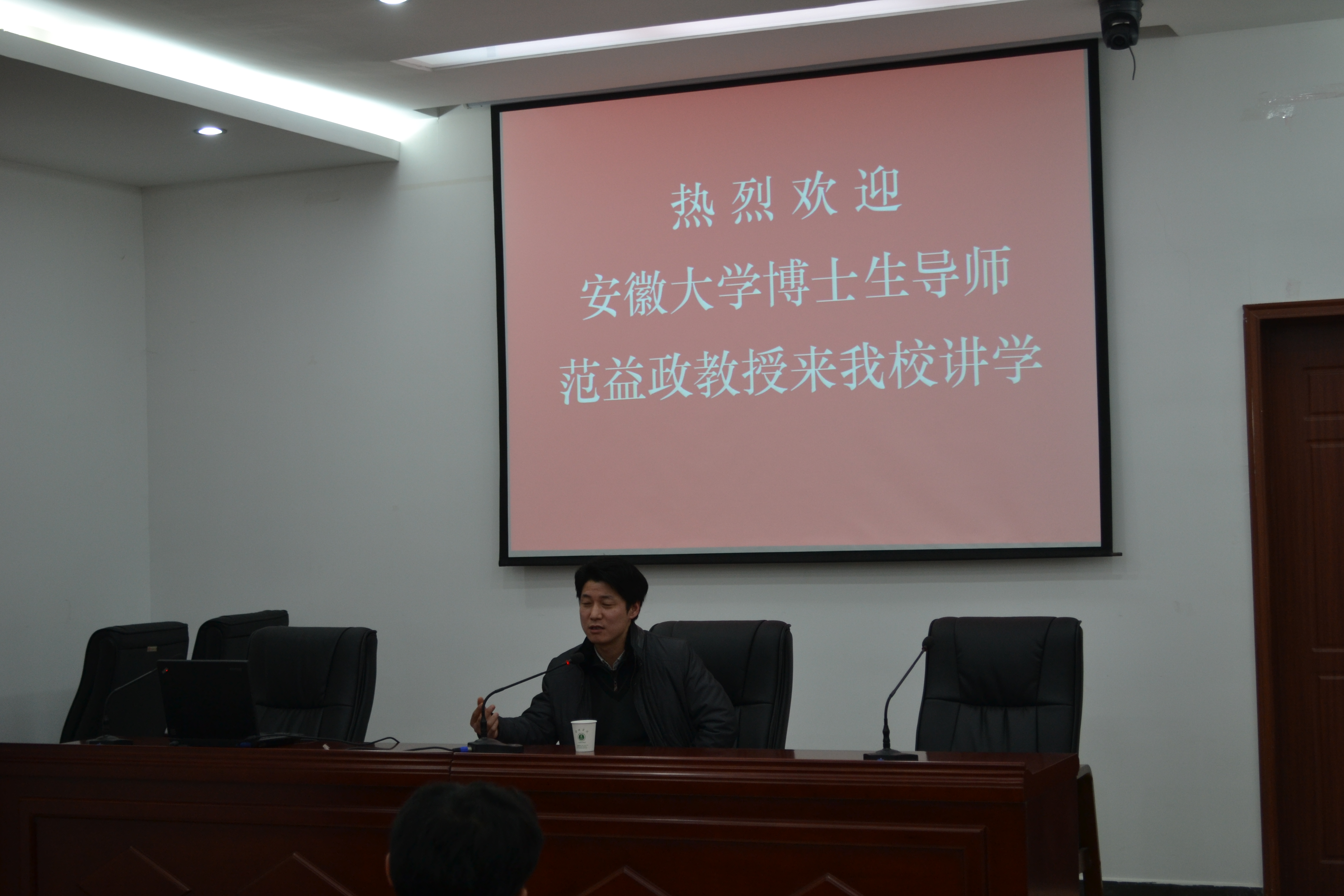 123下午,应数学学院邀请,安徽大学博士生导师、数学科学学院副院长范益政教授来我校讲学,为我校理工类各学院三十余名教师做了关于2013年度国家自然科学基金申报的辅导报告,数学学院翟明清副院长主持了报告会。