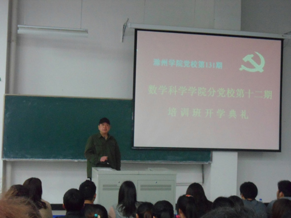 2013年3月9日晚,数学科学学院举行了第十二期分党校开学典礼,典礼由数学学院团总支书记刘洋老师主持,出席典礼的有数学学院党总支书记余志朝,党总支书记助理庞玲玲老师等。本期党校全体学员出席了本次典礼。