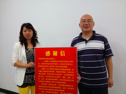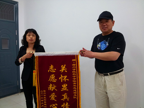 然后,她代表市救助站全体工作人员和被关爱的流浪未成年人对志愿者们的奉献表示衷心的感谢,并向数学学院赠与锦旗和感谢信。该院党总支书记余志朝、团总支副书记刘洋出席赠与仪式。