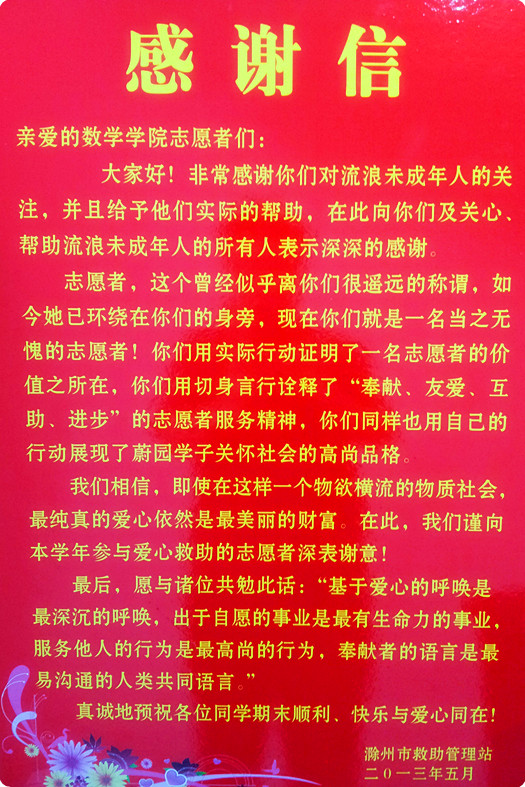 胡副站长表示,在服务基地建立的两个多月里,数学学院志愿者们坚持每周来救助站帮助流浪未成年人,为他们讲述一些基础知识,和他们做游戏。通过这些,使得孩子们在玩的过程中体验快乐,体验温暖。让他们感受到来自社会的爱与关怀,让他们对生活充满信心与希望。