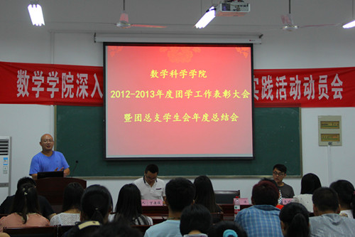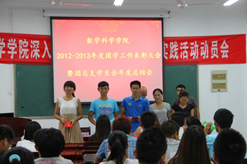 9月2日晚,数学科学学院2012—2013年度团学工作表彰大会暨团总支学生会年度总结会在数学学院会议室举行。数学学院党总支书记余志朝,团总支书记刘洋,学生会主席丁康俊、朱皓然及全体学生会成员参加了此次会议。大会由丁康俊主持。