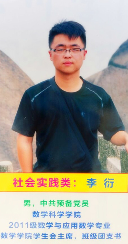 李衍,男,汉族,1992年1月出生,安徽六安人,中共预备党员,数学科学学院数学与应用数学2011级本科生。现任金沙威尼斯欢乐人城数学科学学院团总支学生会主席、数学学院2011级数学与应用数学(保险精算方向)班级团支书、辅导员助理。