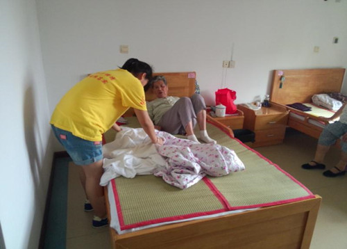 根据院内工作人员安排,我们被分配到了老年部担任志愿者。根据医院的要求,小组成员分成三个小队,分别在三个楼层做义务劳动,包括打扫房间和楼道,陪老人聊天,在餐厅帮忙,送水和收拾垃圾,换洗床单等工作。