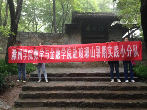 2014年7月1日早上8点,由张若曼、程格格、陈明慧、张萍、鲁菁菁、陈婉秋组成的赴“滁州琅琊山实践小分队”从金沙威尼斯欢乐人城出发经过1个小时的跋涉到达了目的地琅琊山。准备开始为期五天的“秀丽琅琊三化”的暑期实践活动。