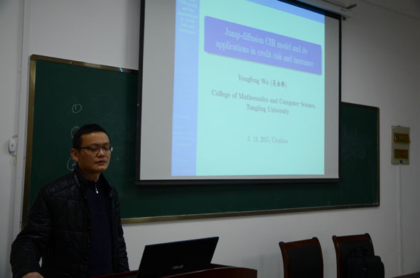 吴教授作了题为《Jump-diffusion CIR model and its applications in credit risk and insurance》的报告,报告中吴教授介绍了国内外金融数学研究的一些主流方向,如期权、期货等衍生证券的定价理论;信用风险模型理论研究;金融计算;现代资产组合理论;资产结构理论;利率期限结构理论;极值理论;保险精算理论等,以及国内金融数学研究水平较高的高校和科研院所。同时,吴教授对金融数学专业论文投稿的部分高级别国际刊物做了分析和介绍,他还与青年教师分享了自己求学和科研过程中的一些经验。吴教授鼓励青年教师夯实自己的专业基础,坚持不懈,切实提高自己的科研业务水平。