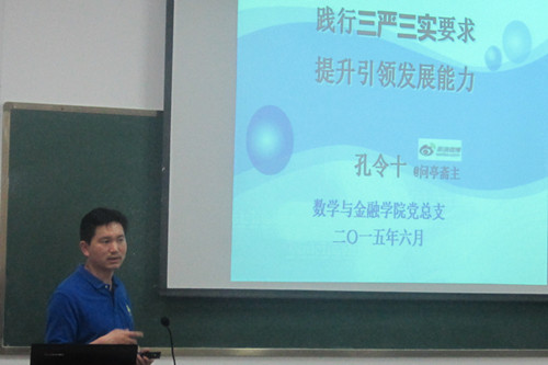 6月10日下午,金沙威尼斯欢乐人城党总支书记孔令十以《践行三严三实,提升引领发展能力》为主题,在数学楼106会议室召开党总支学习会议。金沙威尼斯欢乐人城院长翟明清等三十名教师党员、科级以上干部与会聆听。