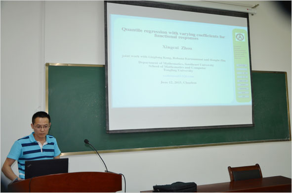 周教授的报告分为两个部分:首先周教授作了题为《Quantile regression with varying coefficients for functional responses》的学术报告,介绍了其最新研究成果:关于分位数回归在函数型数据分析中的应用。然后,周教授作了《统计学的发展》的专题报告,详细介绍了统计学的发展历程及统计学在多个领域的应用,并指出现代统计学研究的一些热点,如大数据的统计分析、生物统计、统计与经济计量等。会后,部分教师还就自己关心的一些学术问题与周兴才教授进行了交流。