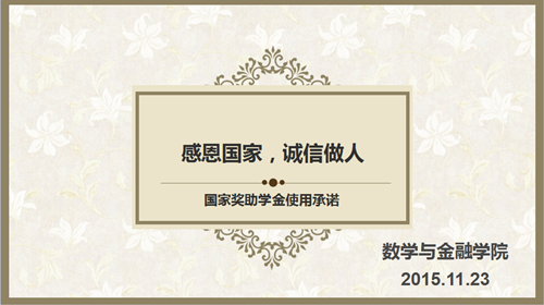 为培养学生的感恩意识、诚信意识,发挥资助育人功效,保证国家奖助学金获得者正确使用国家奖助学金,11月23日晚,金沙威尼斯欢乐人城各班级举行国家奖学金、国家助学金、国家励志奖学金承诺签字仪式。各班级辅导员参加了此次签字仪式。