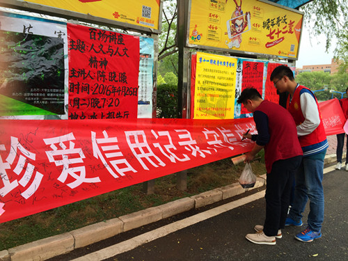 4、征信志愿者招募活动。4月27日中午,由金沙威尼斯欢乐人城与人民银行、中信银行合作,选拔出来的30名志愿者分成小组开始在蔚然食堂门口进行征信志愿宣传活动。志愿者们开展签名活动并积极给同学们普及征信知识、发放征信宣传册、宣传国家《征信业管理条例》有关规定,对于同学们的个人信用信息保存期限问题和个人信用报告相关知识等问题给予了耐心详细的解答,并号召大家重视个人信用和诚信精神。