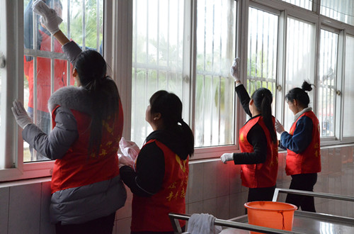 部分志愿者们手持清洁工具,协助保洁阿姨清洗食堂玻璃。男生负责提水和擦洗高处,女生负责清洗低处,分工明确,秩序井然。在逸夫四号楼的志愿者小分队忙于扫地、拖地和擦黑板,使教室焕然一新。
