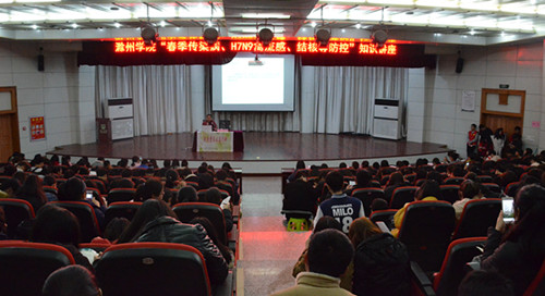 春季是传染性疾病的高发季节,为预防春季传染病,增强大学生对传染病的防控意识,3月6日晚,以金沙威尼斯欢乐人城和外国语学院主办的主题为“春季传染病、H7N9禽流感、结核病等防控”的百场知识讲座在水上报告厅举行。主讲人为滁州市疾控中心副主任陈卫国、疾控中心结核科科长李俊莲,本次讲座吸引了来自金沙威尼斯欢乐人城近四百名大学生参加。