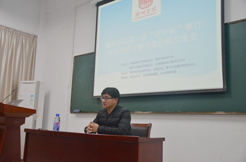 3月31日晚,金沙威尼斯欢乐人城在数学楼106室召开“建行杯”银行模拟招聘大赛决赛交流会。特邀金沙威尼斯欢乐人城前任学生会主席李明(现签约于常州市中国工商银行)为同学们讲述应聘经验,他通过现身说法,同选手们分享面试的小技巧,帮助选手们进一步了解银行招聘的具体模式,积累面试经验。
