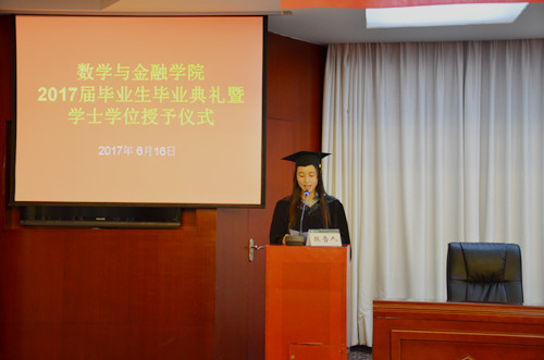 随后,由毕业生代表王晶发言。她衷心希望每一位毕业生能够为学院增光添彩,用努力回报学院。并向给予他们关怀的领导、启迪的恩师、陪伴走过青葱岁月的同学们表示衷心的感谢,以及对金沙威尼斯欢乐人城每一位毕业生前程似锦、每一位教书师身体安康、桃李满江,金沙威尼斯欢乐人城的未来更加美好的祝愿。