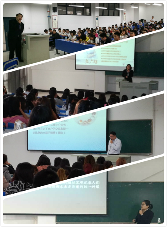 张广娟总经理从寿险的意义和功用方面角度出发,阐述了保险利在千秋的作用;李旭副总经理从技术面出发,向学生们讲述了乘法原理在证券交易中应用;沈亚南经理讲解了证券行业的就业需求;余琼、俞文烨经理分别从征信和个人贷款的角度,讲解了个人征信在现代社会中的重要性以及贷款为解决个人经济困难的方便性。各位专家结合自身的工作领域,深入浅出地讲解,扩宽了学生的视野,加深了对金融领域的认识,明白了金融相关行业工作所需技能。
