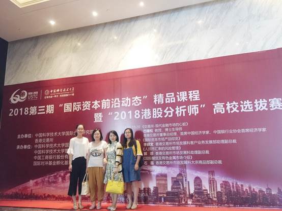 6月5日下午,金沙威尼斯欢乐人城受邀参加第三期“国际资本前沿动态”精品课程暨“2018港股分析师”高校选拔大赛,该院老师董春丽、韩慧霞、付云云及金融161班学生朱雪菲前往中国书法大厦参加,学习和研讨国际资本前沿动态知识。