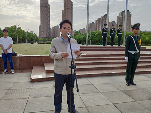 学生代表朱国权在国旗下发言。他表示,作为新时代大学生要有站位、有思想、有境界,调整心态砥砺奋斗,让青春成为中华民族生气勃发的持久风景。