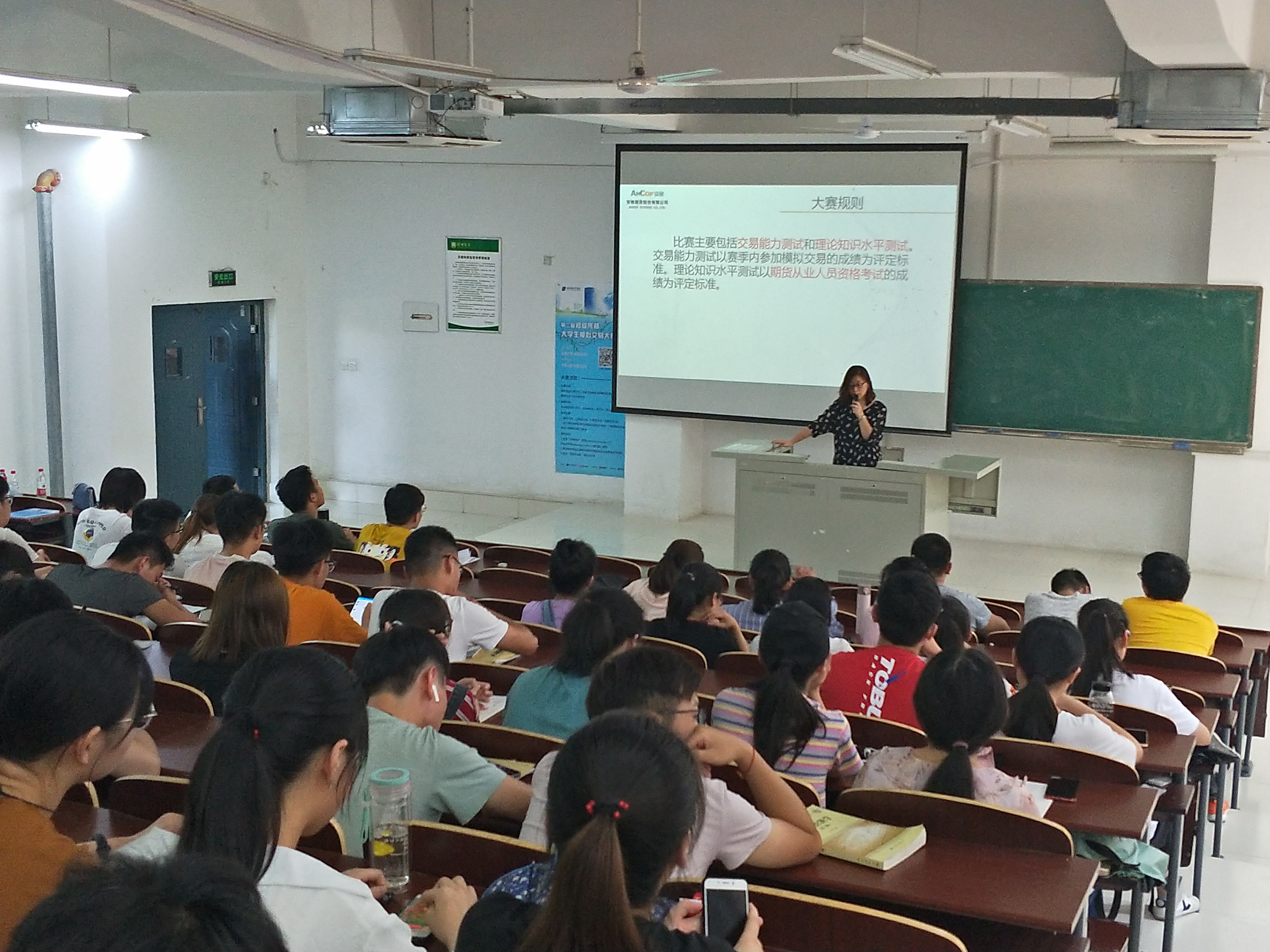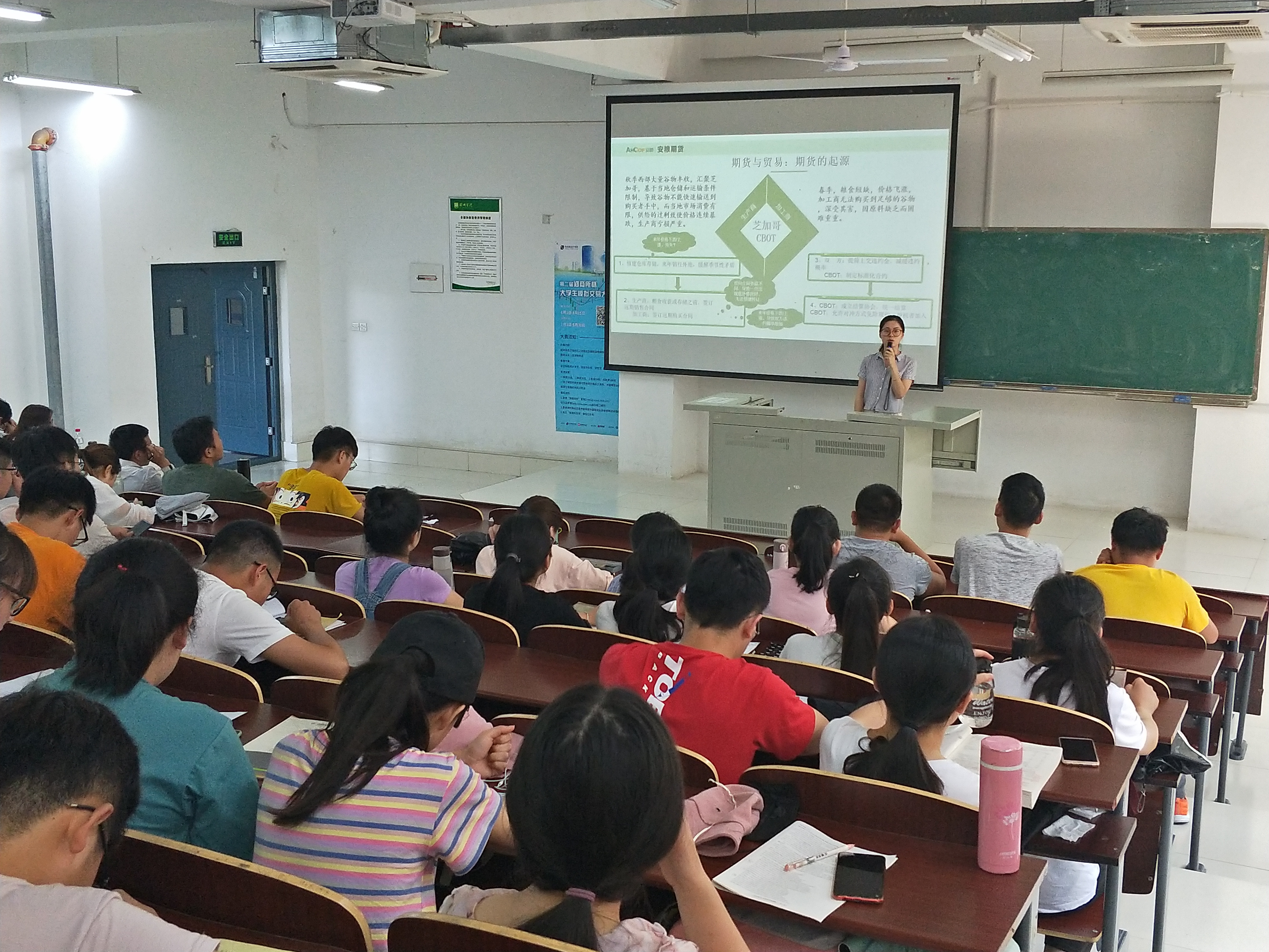 6月12日下午,安粮期货股份有限公司人力资源部总经理梁蕾一行来金沙威尼斯官网举办第二届“郑商所杯”大学生模拟交易大赛宣讲会。宣讲会的地点在逸夫楼4108J,参会人员有金沙威尼斯欢乐人城16级、17级和18级金融工程专业学生以及金融工程系的部分老师,全场座无虚席。