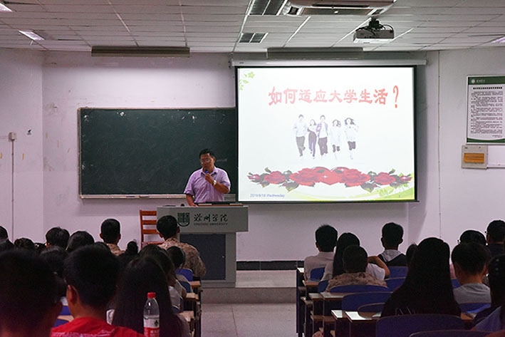卞佩峰以“如何适应大学生活”为题,从校园环境、人际关系、学习、心理、经济、纪律等六个方面阐述了需要适应的大学生活内容,并结合大学校园生活常见的案例进行深入剖析,提出相应的解决问题方法。他希望新同学提高执行力,积极面对困难与挑战,学会选择、学会成长。他欢迎同学们与他分享欢乐与忧愁,他也非常乐意为同学们排除烦恼、解开心结。