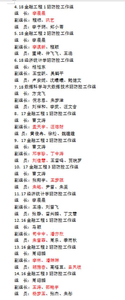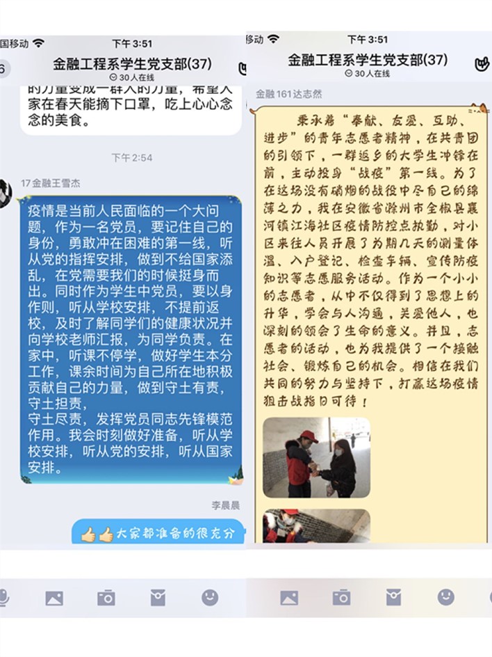 二是统筹做好各班级疫情上报工作,特别加强对同学线上课程学习的监督,落实“停课不停学”工作。本支部共有20名同志分别担任学院防疫小组的组长和成员,每天履职履责。