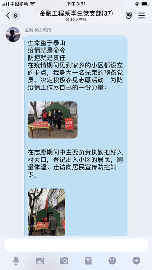 三要强化模范带头。党员要以身作则、身先士卒,带领全院学生干部在学习上、疫情防控工作上始终冲锋在一线、战斗在一线,既扛起责任、靠前指挥,又善于统筹、科学组织,奋力夺取疫情防控和完成学习任务双胜利。我支部陈雨和达志然两位同志在全椒县鲁庄巷点及大世界点担任防疫志愿者,负责执勤把好入村关口,登记居民出入,测量体温,走访并向居民宣传防疫知识等。