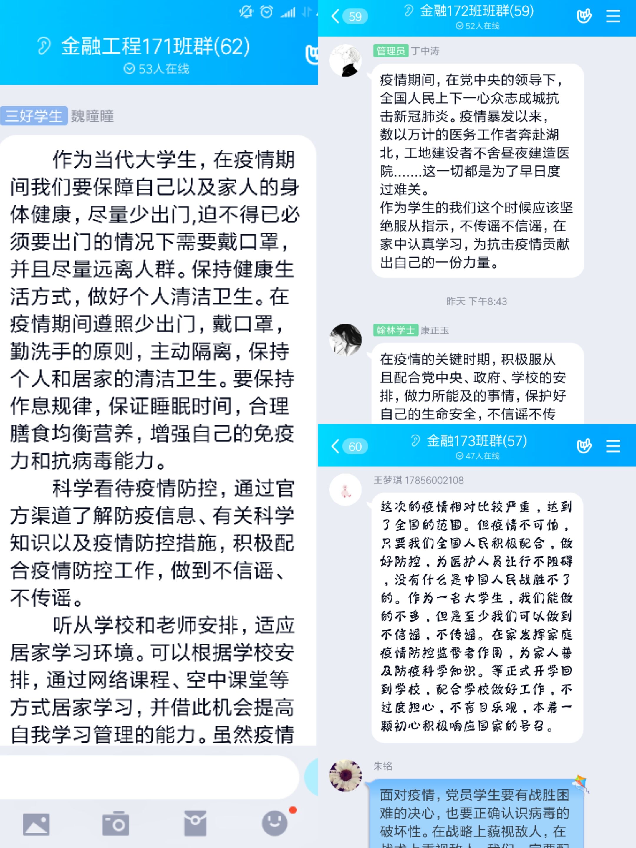 随着全国新型冠状病毒防疫工作进入到关键时期,为充分发挥学生基层组织在此次抗击疫情工作中的凝聚、引领和服务作用,17级金融工程班在辅导员曹文涛的组织下利用新媒体新技术开展形式多样、内容丰富的网络主题班会,大家在线上进行了卫生防疫知识的学习、讨论发言,用实际行动助力疫情防控,为防“疫”工作营造了良好的氛围。