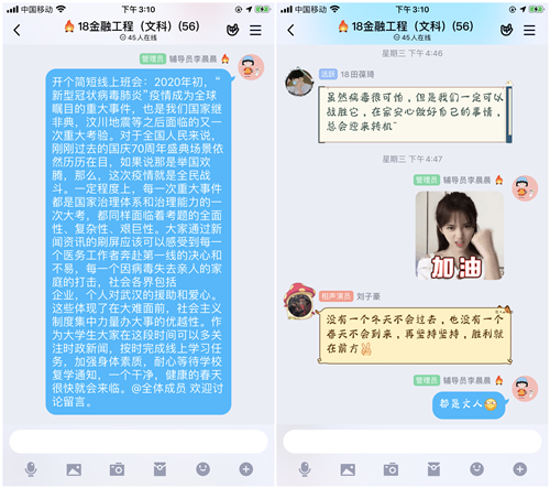 同时在辅导员李晨晨的组织下利用网络召开了以“同心战役”为主题的一场别开生面的网络班会。通过班会主题她向同学们科普了“什么是新型冠状病毒、预防病毒的途径与方法、病毒形成的原因”等内容。她说新型冠状病毒感染所致肺炎,起初发热,乏力,干咳,逐渐出现呼吸困难,具备人传人的能力,同学们一定要做好防护,正确佩戴口罩,注意观察自身症状,一旦感染多数预后良好,少数病情危重,甚至可能死亡。另外对于新型冠状病毒形成的原因,大家各抒己见,同学们一致认为是人类对大自然过多的索取所致,我们需要一个人与自然和谐相处的环境。说到如何预防,大家更是畅所欲言,把自己所知所用毫无保留地分享给同学们。