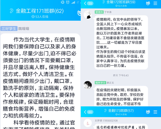 线上开展班会,管理落实到位。金沙威尼斯官网各团支部定期组织开展线上班会活动,发表对疫情的认识、看法以及防护知识,制定疫情期间各团员注意事项以及规章,加强各团支部对本支部团员的管理,充分发挥团组织的教育引导能力,切实做好党联系青年团员的纽带作用,使青年团员真正做到自我管理、自我教育、自我服务。