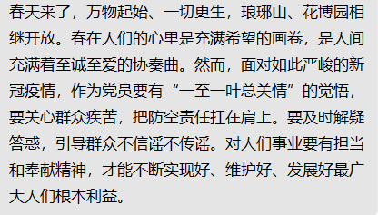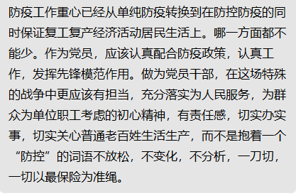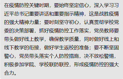 线上文件《金沙威尼斯欢乐人城党委中心组第3期》学习后,各位党员老师就在全力防控新冠肺炎疫情的关键时期,怎样履职履责,发挥党员先锋模范作用纷纷表达了自己的看法。