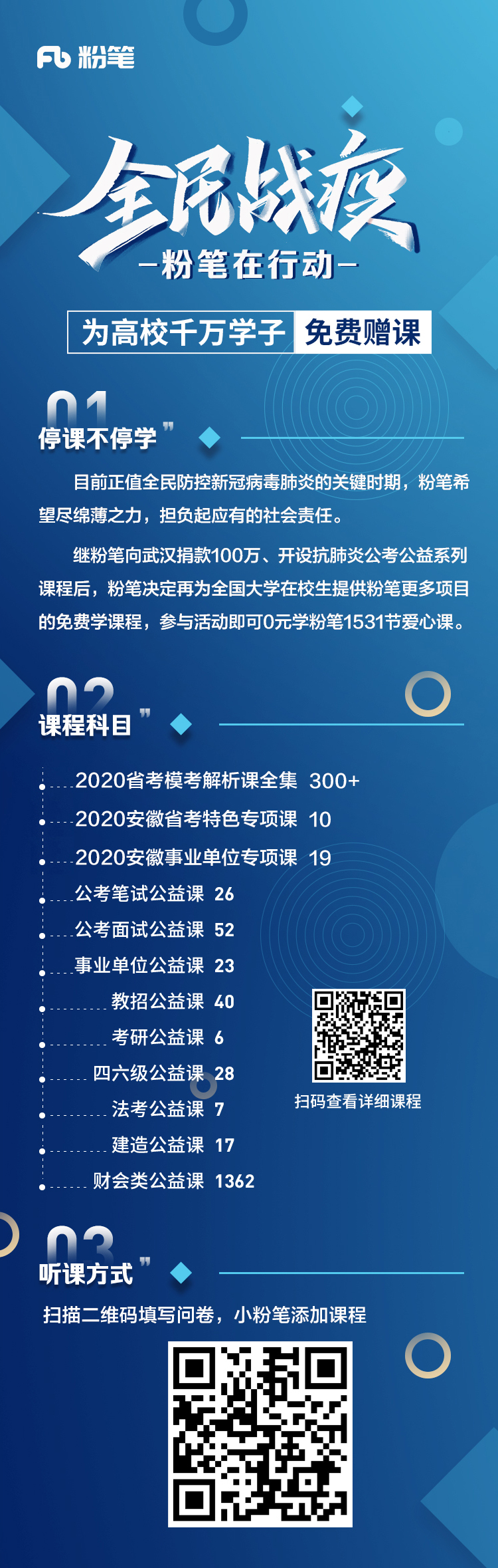 为帮助2020届毕业生在疫情防控期间做好求职准备和考研复试的备考复习,粉笔教育安徽分校推出“停学不停课”线上公益就业指导课程。