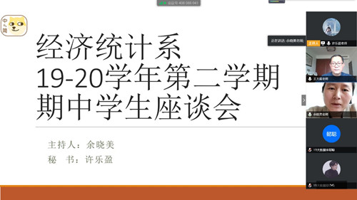 疫情特殊时期,4月15日下午,经济统计系在线上开展了期中学生座谈会,经济统计学和大数据专业共16名学生代表、校督导组成员杨慧卿老师及院督导员王大星老师参加,会议由余晓美老师主持,许乐盈老师记录。