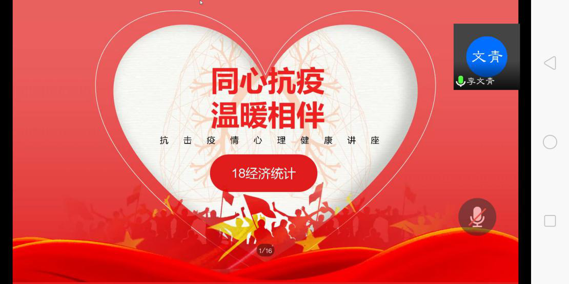 2020年5月27日星期三,18级经济统计学专业开展了以“同心抗疫,温暖相伴”为主题的心理主题班会,由于受疫情影响,本次班会以线上形式开展。