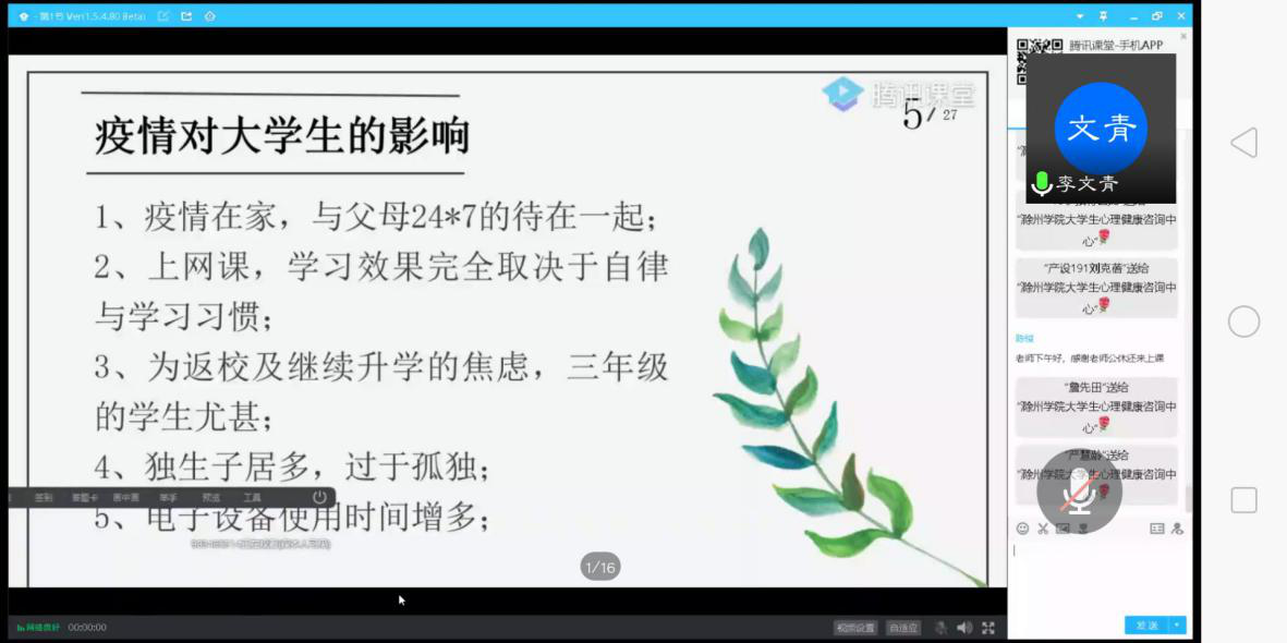 本次班会开始后,在心理委员李文青的有效组织下,全班同学在线上认真观看了朱莉老师关于“疫情期间大学生家庭关系调适与自我成长”为主题的心理学讲座。随后心理委员强调全班同学疫情期间在家进行自我隔离的同时,也应适当调整自身的心理状况,保持乐观的心理状态,在制定学习计划,保持生活学习规律有序的同时,也要与家人有效沟通,增进理解信任与家人暖心相伴。
