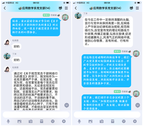 7月1日下午,应用数学系党支部开展了廉政教育线上专题党课暨七月份主题党日活动。本次会议由党支部书记范媛媛主持,支部全体教师党员通过qq群文字输出的方式在线参与了会议。