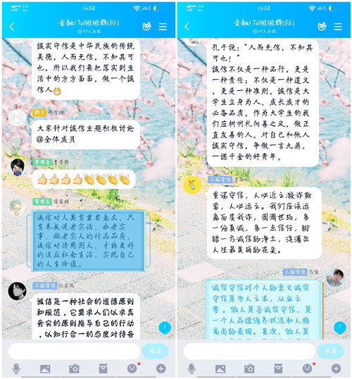 随后,曹文涛组织集中观看《诚值》《贷价》等影片,教育学生要防止网络诈骗,网络贷款,增强防范意识。对于2020年高考,曹文涛给同学们普及违纪作弊、涉考犯罪等内容,每位学生要充分知晓充当“枪手”、参与高考作弊的严重后果,参与高考替考作弊将会被开除学籍,并接受刑事处罚的严重后果,同学们要自觉抵制违纪作弊行为。会后,同学们在辅导员带领下,以“诚信”为主题,在班群内发表讨论。