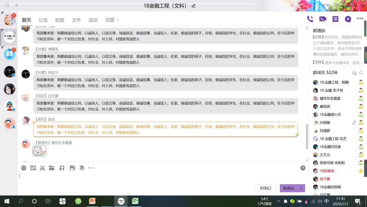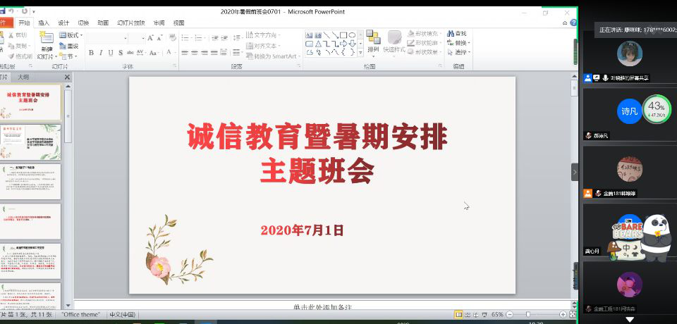 为积极响应学校有关“诚信教育活动月”活动的号召,养成讲诚信的好习惯,形成优良学风并加强同学们的暑期安全教育,金融181,182班于7月1日上午联合展开了以“诚信教育暨暑期安全教育”为主题的线上班会。此次讲座由辅导员和资助委员叶晓雅,郝诗凡主持,18级金融工程系全体同学线上参与。
