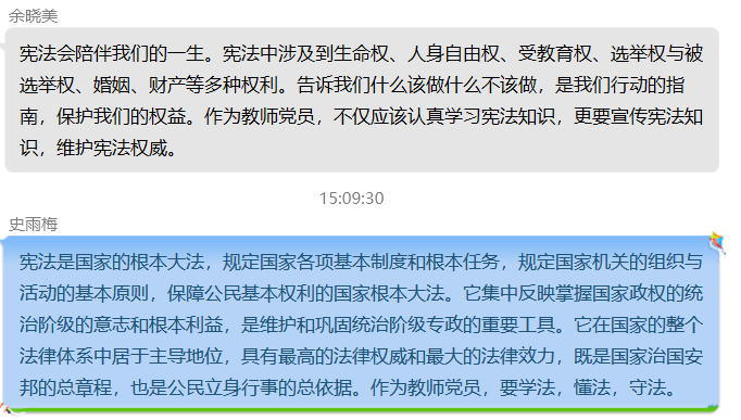 线上中华人民共和国宪法(全文)学习后,各位党员教师就学习中华人民共和国宪法的体会和感悟纷纷表达了自己的看法。王大星说宪法以其至上的法制地位和强大的法治力量,有力地坚持了中国共产党领导,是我们国家和人民经受住各种困难和风险考验、始终沿着中国特色社会主义道路前进、实现中华民族伟大复兴中国梦的根本法制保障。包建国说通过宪法知识学习,充分认识到宪法是国家根本大法,治国安邦的总章程,不仅是对公民权利进行确认和保障,同时是对国家权力的设置和行使进行了规范,是保持公共权力与公民权利的协调与平衡的根本规范。作为一名党员,我会自觉增强宪法意识,维护宪法权威。