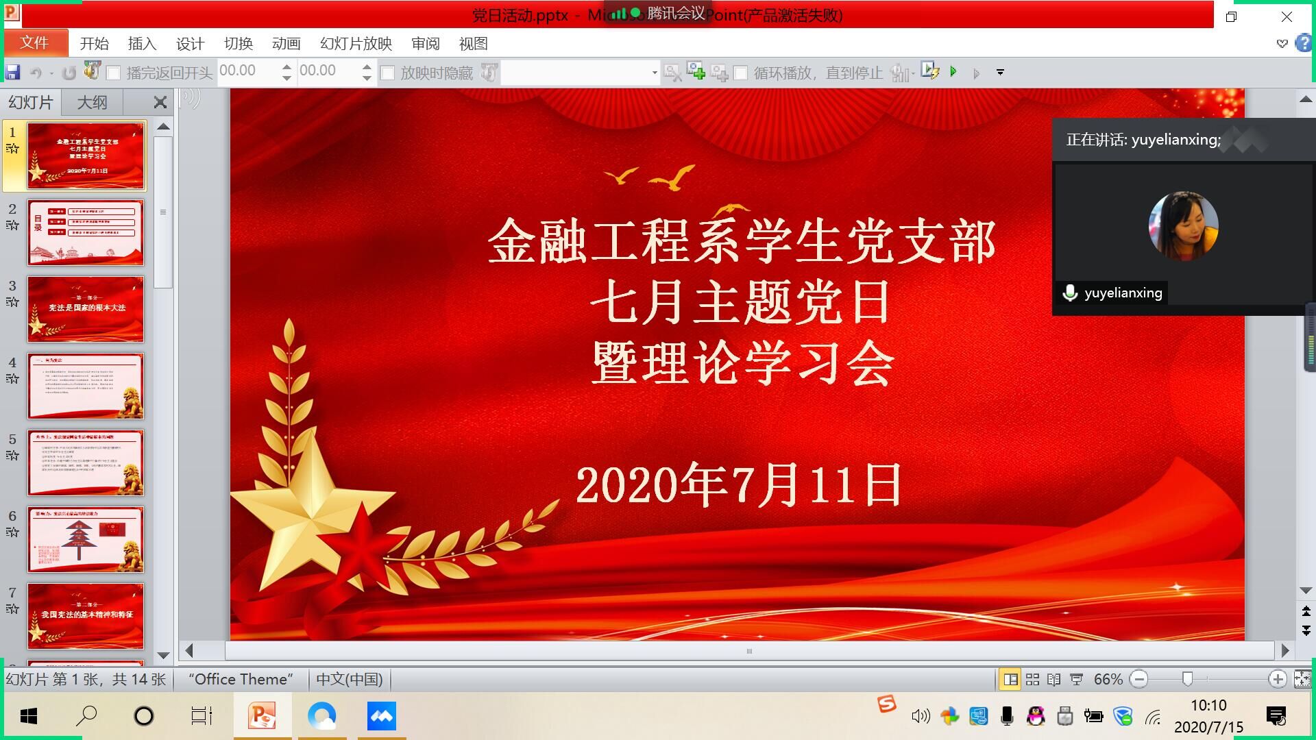 根据院党委要求,为贯彻落实习近平总书记关于宪法学习宣传教育的系列重要指示精神,维护宪法权威,增强学生党员法治意识,金融工程系学生党支部于7月11日通过腾讯会议开展线上主题党日暨理论学习活动。