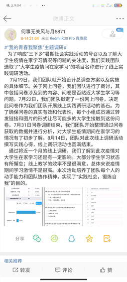 通过将近一个月的线上调研,我们了解到此次疫情对大学生在家学习还是有一定影响。大部分学生学习状态有所懈怠;线上教学的效率不是很满意,总体来说疫情期间学习激情不是很高。本次活动培养了团队每个人的动手能力和团队协作精神,实现了“实践社会,锻炼自我”的目的。(通讯员:周绍鹏)