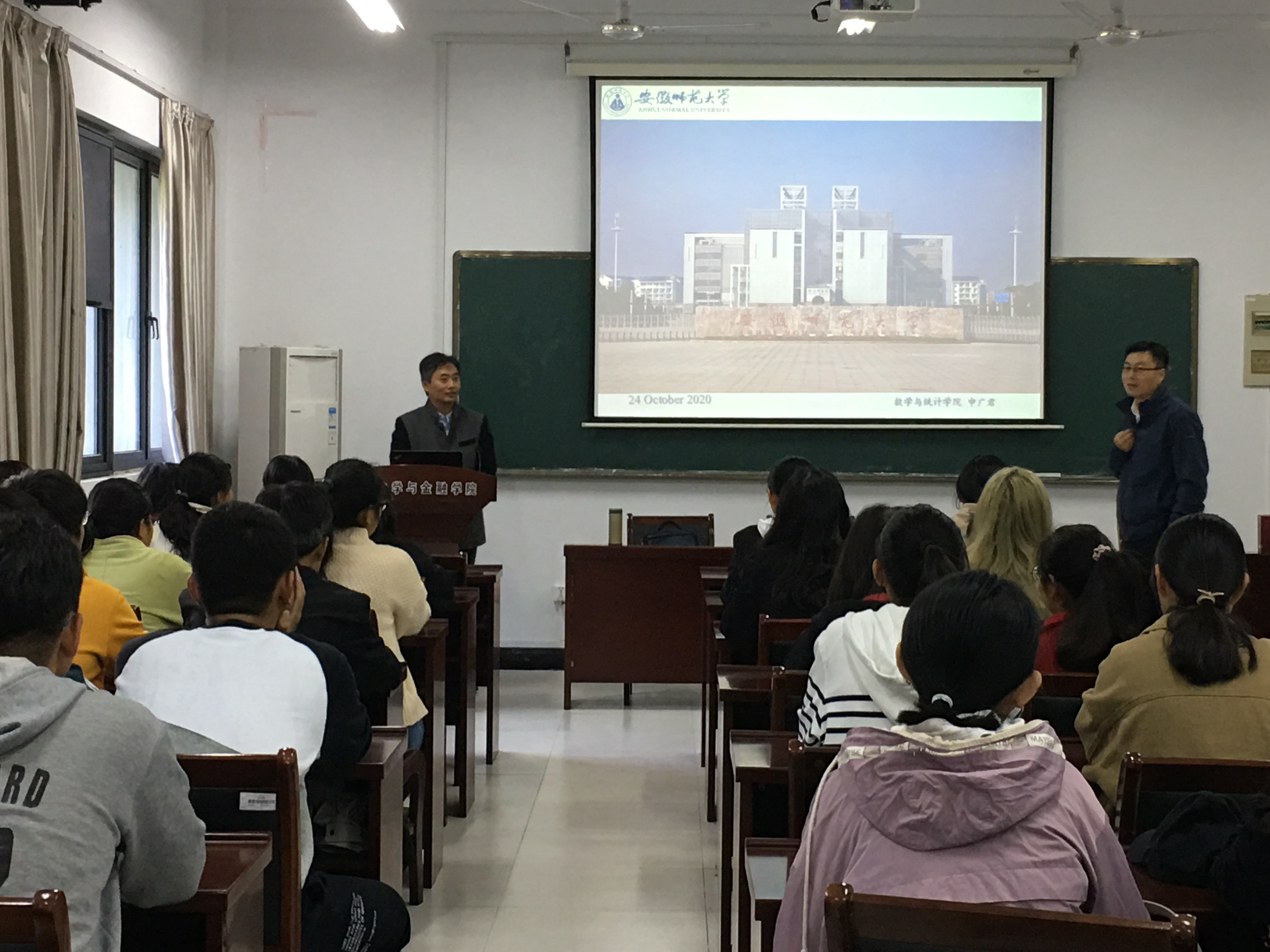 10月24日,金沙威尼斯官网邀请安徽师范大学申广君教授开展《漫谈概率论与数理统计》主题讲座,讲座由副院长王圣祥主持,金沙威尼斯欢乐人城部分教师、20级经济统计专业新生参加。