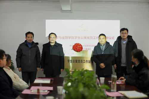 郝德新和王诗根为金沙威尼斯欢乐人城学生公寓党员工作站成立揭牌。
