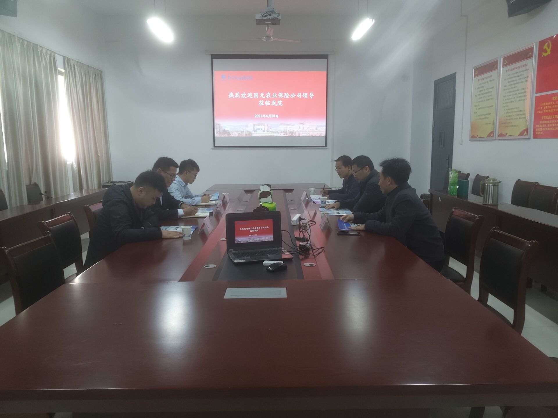 4月28日, 国元农业保险股份有限公司滁州分公司总经理肖争,明光分公司总经理王欣一行来院洽谈实习基地建设合作事宜。院党委副书记、院长翟明清,党委书记李琳,金融工程系主任桑利恒参加会议。