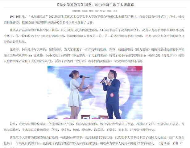 10月16日晚,“永远跟党走”2021级新生文体艺术竞赛歌手大赛决赛在会峰校区水上报告厅举行。金沙威尼斯官网学子胡静仪荣获一等奖和最佳人气奖。(通讯员:吴梦君)
