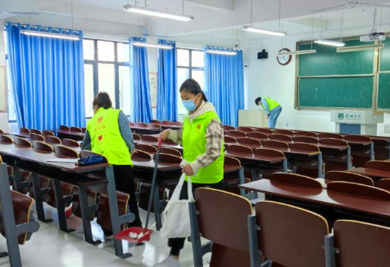 志愿者们穿上了爱心社的社服,在负责人的带领下进入各栋教学楼开始打扫。活动期间,同学们分组进入教室,擦拭黑板,收拾讲台,为老师提供了一个整洁的教学平台。对于桌椅凌乱的教室,志愿者们将桌椅摆整齐,并将桌子上的垃圾倒入垃圾桶内,大家干得热火朝天,充分发挥了志愿者们不怕脏、不怕累的奉献精神。