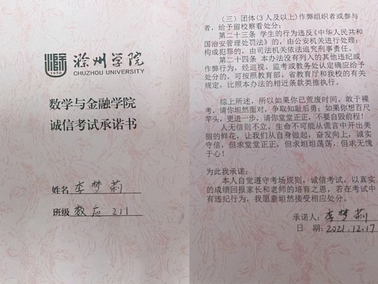 班会在“信义老爹杜长胜”的纪录片中拉开帷幕。荣老师从生活中的失信现象,大学生考试违纪心理分析,以及考试违纪的刚性成本、经济成本、附加成本多个角度引导学生自觉抵制违纪作弊行为,并带领大家学习《教育法》《中华人民共和国刑法(修正案九)》以及学校《学生手册》中关于考试违纪作弊、涉考犯罪等内容。她动员同学们签订金沙威尼斯欢乐人城《诚信考试承诺书》、进行诚信考试宣誓。