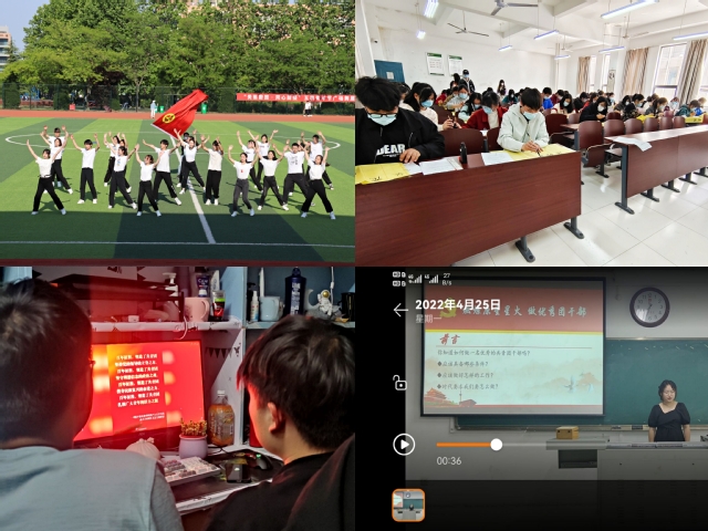 悟——线上线下、有机融合、共悟成长。各班团支部开展“红歌接力唱”、 美丽蔚园广场舞展演、“青春献礼二十大,强国有我新征程”大学生讲思政课比赛、“青春喜迎二十大,建团百年正风华”五四表彰大会、“笔墨丹青·红心向党”书法大赛、我与团旗合个影、入团仪式、重温入团誓词等形式多样的主题活动,同时观看 “青春万岁”和“青春心向党,建功新时代”主题网络直播,参与学习线上云团课,聆听党的教诲,在丰富多彩的系列活动中感悟真理和实践力量。