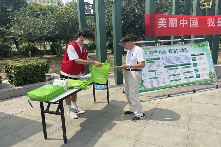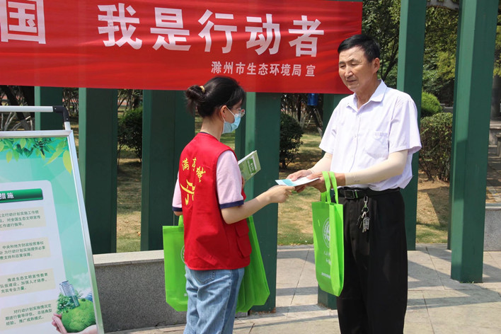 小队成员通过分发环保袋、环保手册等方式对保护环境这一理念进行宣传。小队成员先前往滁州市环保局机关党委接受基础技能培训,然后在清流河公园进行文明宣讲与宣传。
