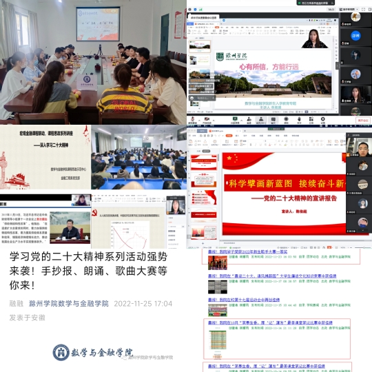 强化使命感,让入学教育更有高度。扎实开展理想信念主题教育,学院继续举办《我与书记面对面》中秋座谈会,马克思主义学院教师李晨晨为新生们讲授《心有所信,方能远行》课程,学院组织新生在烈士纪念日、党的二十大开幕会、一二九运动、国家公祭日、宪法宣传周、江泽民同志追悼大会等重大时间节点开展爱国教育活动;构建课堂、网络、实践三位一体的思想教育格局,着力推进使命感教育,学院开展“党的二十大精神进课堂”课程思政系列讲座,强化课堂教育与日常思想教育的融合,邀请了马克思主义学院陈光洁老师、校团委副书记胡娜老师、辅导员陈俊超老师进行学习党的二十大精神理论知识宣讲;利用微信、抖音等网络新媒体,发布学习贯彻宣传党的二十大精神主题教育活动等相关信息;通过观摩暑期社会实践话成长交流汇报会、开展数学主题日、经济热点大赛、金融视频大赛、新生寝室设计大赛、新生最美笔记大赛等实践活动营造良好学习氛围,激发创新热情;学院组织新生积极参加校园实践活动,目前在新生歌手大赛获一等奖1人,在“笔墨生香,厚‘记’薄发”最美课堂笔记大赛中获一等奖1人、二等奖2人,三等奖3人,学院连续2次获优秀组织奖。学院高举中国特色社会主义伟大旗帜,开展使命感教育,引导新生树立远大理想,争做新时代德、智、体、美、劳全面发展的社会主义建设者和接班人。(通讯员:吴梦君)
