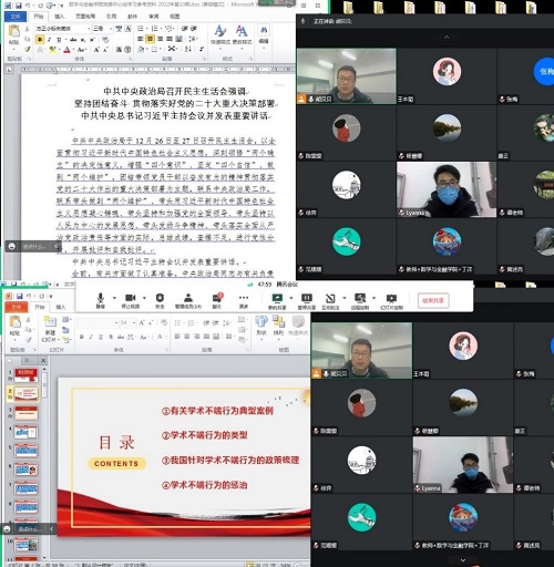 12月30日下午,应用数学系党支部开展线上“科研诚信”主题党日活动。全体党员教师参加学习。活动由支部书记胡贝贝主持。