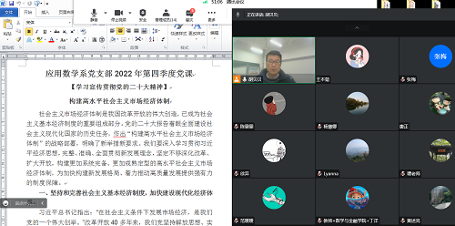 12月30日下午,应用数学系党支部书记胡贝贝为全体党员作《学习宣传贯彻党的二十大精神——构建高水平社会主义市场经济体制》专题党课。